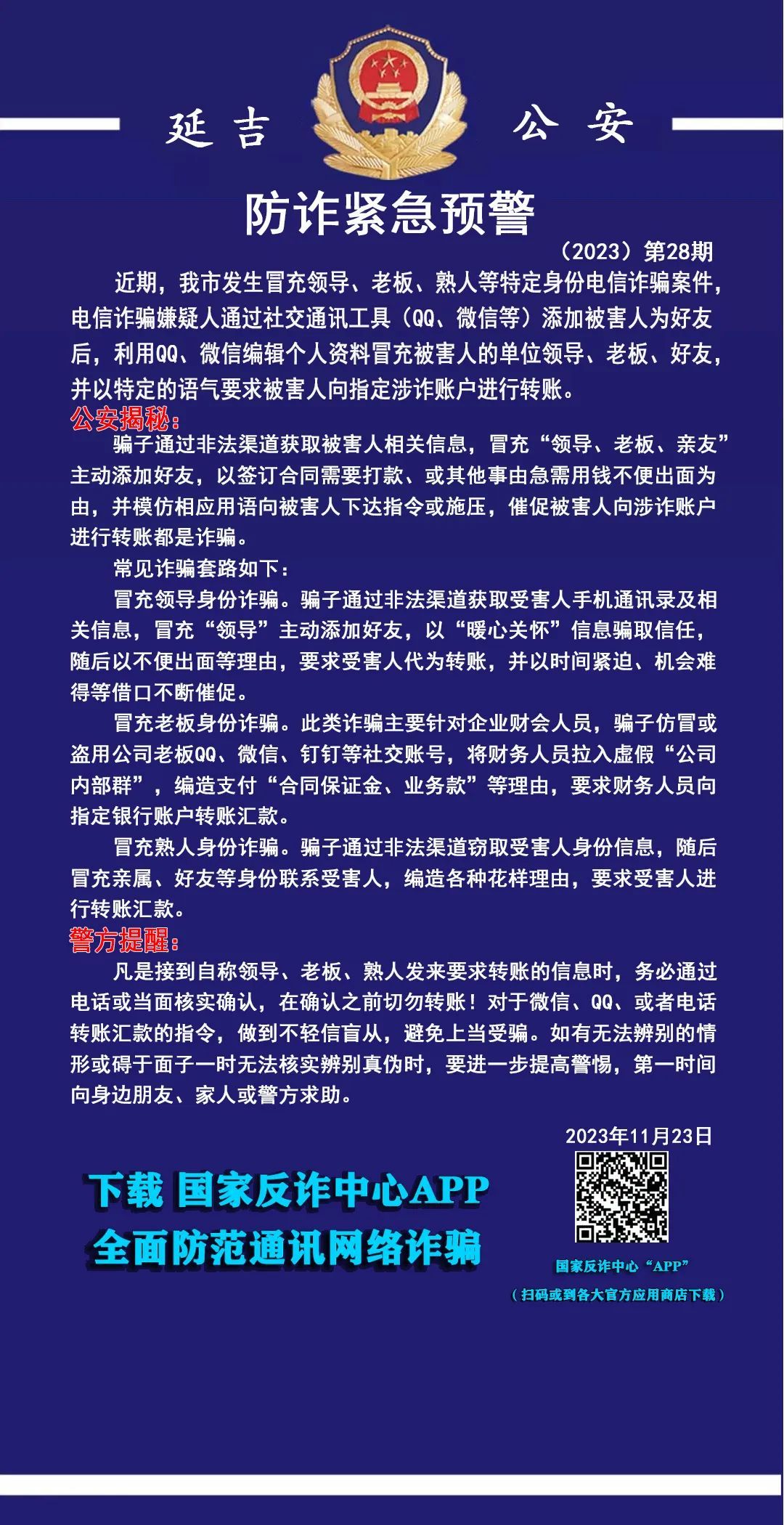 최근 연길시에서 령도, 사장, 지인 등 특정신분을 사칭한 전신사기사건이 빈번하게 발생하고 있는데 전신사기 용의자는 소셜미디어(QQ, 위챗 등)을 통해 피해자를 친구요청한 후 QQ, 위챗을 통해 개인정보를 작성하고 피해자의 단위 령도, 사장, 친구를 사칭함과 아울러 특정된 어투로 피해자에게 지정된 사기관련계좌에 입금할 것을 요구한다.