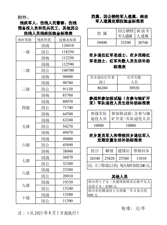 1. 영예군인(장애인 경찰, 장애인 예비역, 장애 군인과 민공, 기타 공무상 장애인 포함)의 장애 위로금, 렬사의 유족(공무상 희생 군인 유족, 병사 유족 포함)의 정기 무휼금, 고향에서 퇴역한 로홍군전사(홍군 실종자 포함)의 생활 보조금 기준을 조정한다. 조정 기준은 아래와 같다.