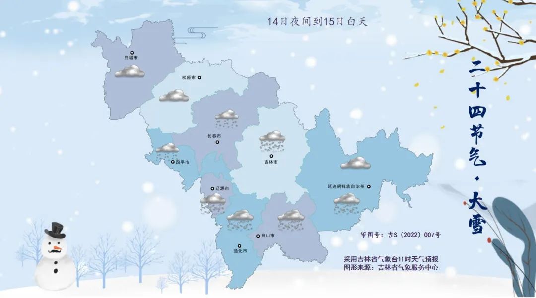14일 밤부터 15일 낮까지 길림성은 흐리겠고 통화, 백산, 연변 남부, 장백산보호구에는 폭설이 내리겠으며 부분적 지역에는 큰 폭설이 내리겠고 길림, 료원에는 중등 정도의 눈에서 큰 눈이 내리겠으며 장춘, 사평에는 적은 눈이 내리겠고 기타 지역의 부분적 지역에는 소낙눈이 내릴 것으로 예상된다.