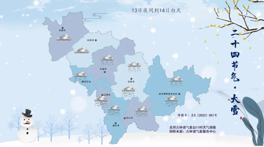 13일 밤부터 14일 낮까지 길림성은 구름이 많던 데로부터 흐르겠으며 통화, 백산에는 큰 눈이 내리겠고 길림 남부, 료원, 연변 남부, 장백산보호구에는 중등 정도의 눈이 내리겠으며 장춘, 사평, 길림 북부, 연변 북부에는 적은 눈이 내릴 것으로 예상된다.