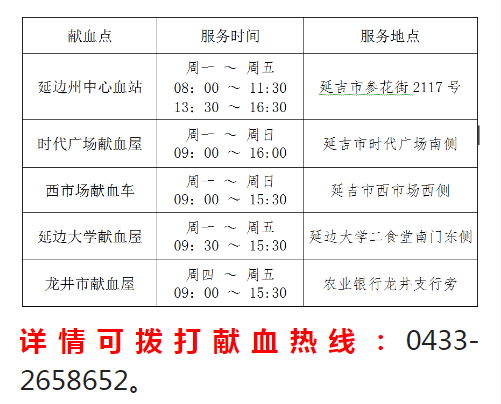이에 연변주중심혈액소는 시민들에게 헌혈과 생명 릴레이에 적극적으로 참여할 것을 촉구할 것을 창의했다. 무료 헌혈에 참여하는 시민은 연변주중심혈액소, 시대광장 헌혈하우스, 연길서시장 헌혈차량, 연변대학 헌혈하우스, 룡정시 헌혈하우스(농업은행 부근) 등 곳에서 헌혈할 수 있다.