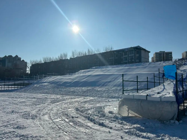 요즘 연길시 무지개다리 남쪽 부르하통하 빙판에서 눈비탈 등 조형의 빙설놀이시설 건설이 한창이다.