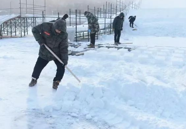 현장에서 조설기가 굉음과 함께 끊임없이 눈안개를 내뿜고 눈안개는 공중에서 응결된 후 일군들이 세운 철골대에 뿌려진다. 일군들은 또 눈을 주형에 넣고 두발로 꽁꽁 밟아 다져서 장방체 모양의 눈덩이를 만들어 눈밭과 담장을 만든다.