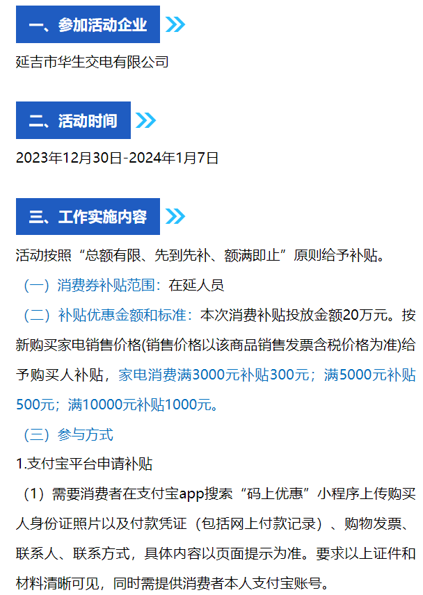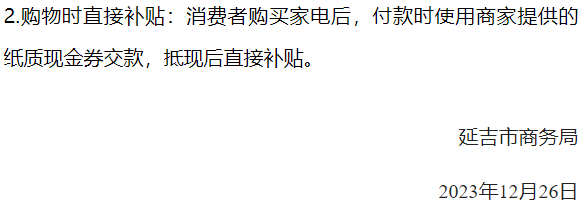 소비신심을 한층 더 진작시키고 가전제품시장의 활력을 불러일으키고저 연길시정부는 양력설 명절과 결부하고 '정부 지원, 기업 보조' 방식을 통해 적극적으로 기업을 위해 판촉협력플랫폼을 구축하고 새해맞이 가전제품 소비보조금 판촉활동을 전개하게 된다. 구체적인 사업 실시방식은 아래와 같다.