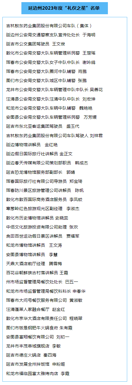 20차 당대회 정신을 깊이 관철 시달하고 중국꿈과 사회주의 핵심가치관으로 공동인식을 응집하며 힘을 모아 중화전통미덕과 시대의 새로운 풍조를 고양하기 위해 2023년 주당위 선전부는 문명교통, 문명관광, 문명료식 계렬 "례의 연변" 주제활동을 전개했는데 일련의 례의 바르고 례의를 갖추며 례의를 중시하고 제창하는 선진전형들이 용솟음쳐 나왔다. 구체 명단은 다음과 같다.