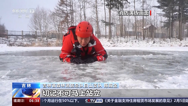 길림성 삼림소방총대 백산지대 진현금: 몸 전체가 물에서 나온 후에는 바로 서지 말고 계속 엎드린 자세를 유지해야 한다. 이는 인체가 얼음판에 엎드려 있을 때 집중응력점을 줄이고 얼음판이 힘을 받는 면적을 증가시켜 얼음판이 힘에 의해 다시 붕괴될 위험을 줄일 수 있다. 다음 구르거나 엎드려 기여가는 방식으로 안전하게 강가로 이동해야 한다.