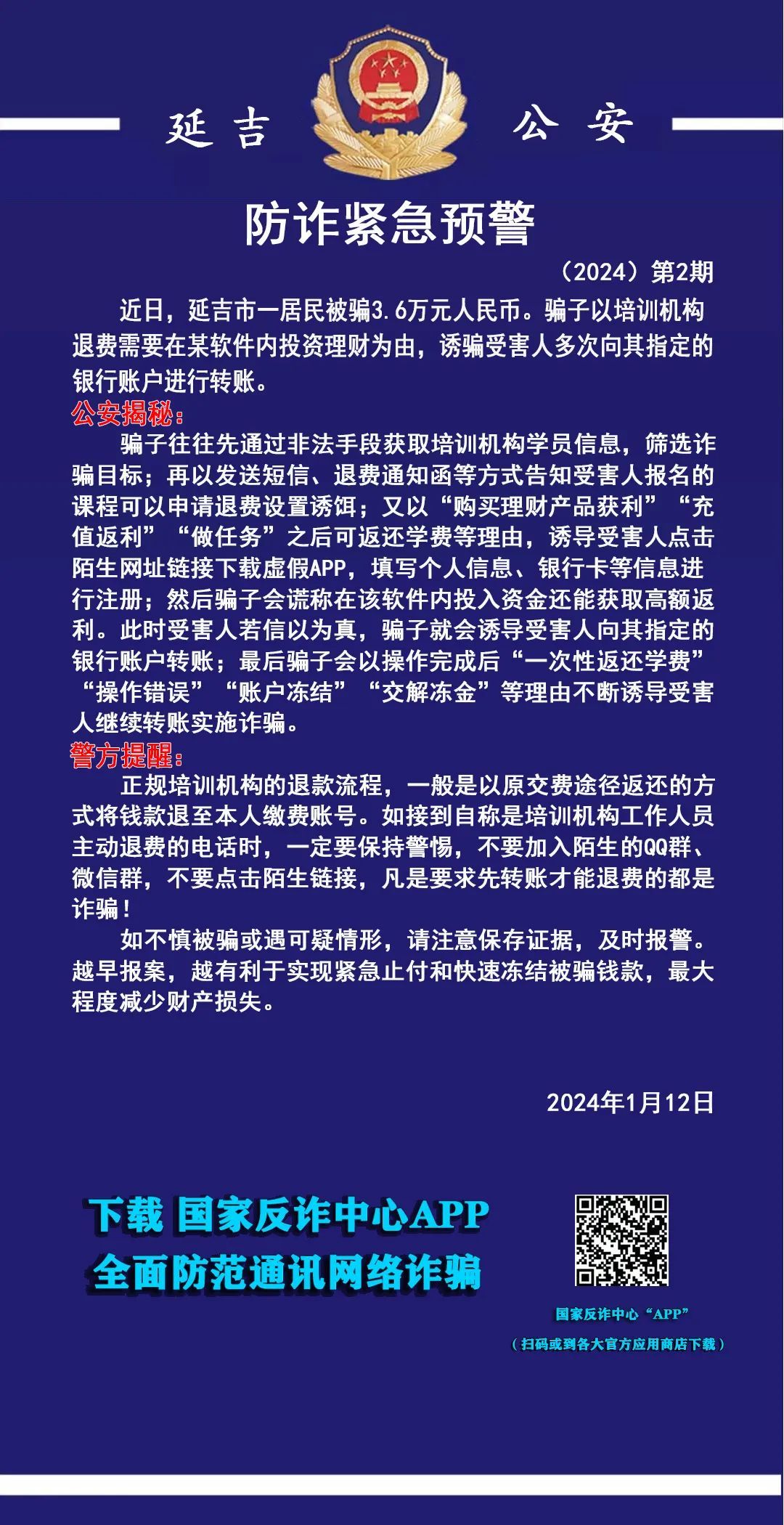 최근 연길시 한 시민이 교육비용 환불사기를 당했다. 사기군은 양성기구의 교육비용을 환불받으려면 모 소프트웨어에서 재테크상품을 구매해야 한다면서 피해자가 여러차례에 거쳐 지정된 은행계좌에 입금하도록 유도해 3.6만원을 사기를 쳤다.