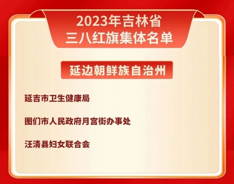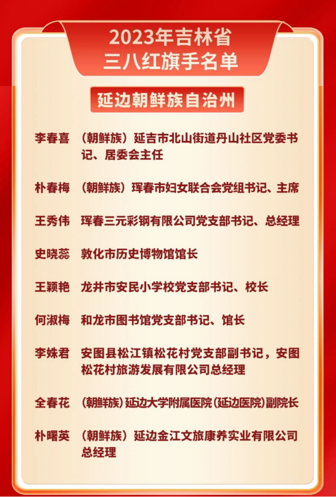 일전, 길림성인력자원및사회보장청, 길림성부녀련합회는 로덕평 등 10명의 개인에게 '길림성 3.8붉은기수 모범' 칭호를 수여하고 위아평 등 98명의 개인에게 '길림성 3.8붉은기수' 칭호를 수여하며 장춘시 관성구 흔원가두부녀련합회 등 50개 집체에 '길림성 3.8붉은기수 집체' 칭호를 수여하기로 결정했다. 그중 연변주에서는 3개 집체, 10명 개인이 명단에 이름을 올렸다!
