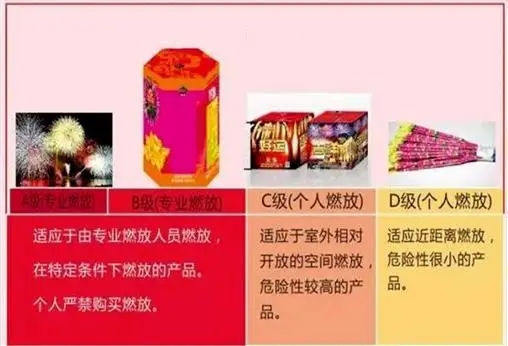 GB 10631-2013 <불꽃폭죽의 안전과 품질>, GB 31368-2015 <불꽃폭죽의 포장>, GB 24426-2015 <불꽃폭죽의 표지>등 표준에 따라 불꽃폭죽의 소비 류형과 제품 등급을 정확하게 식별하고 개인은 ‘개인용 폭죽류’ 제품과 ‘C급’ 또는 ‘D급’으로 표시된 제품을 구매해야 한다.