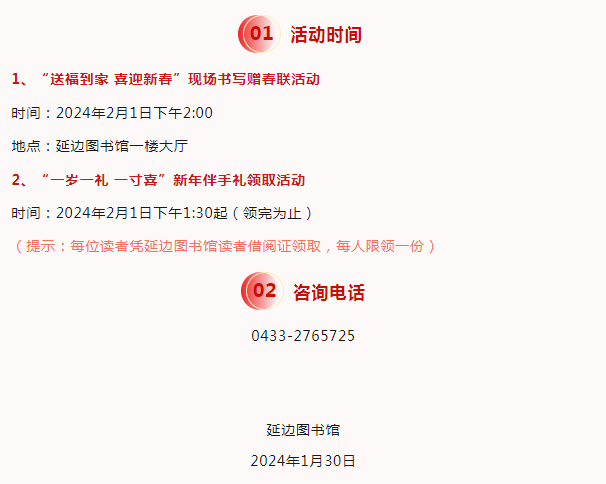 새해를 맞으며 중화 우수 전통문화를 고양하고 독자와 시민들에게 상서로운 명절분위기를 선사하기 위해 연변도서관은 연변주서예가협회 서예가들을 초청하여 '새봄맞이 축복전달' 활동을 전개했는데 활동에서는 독자와 시민들을 위해 음력설 춘련, '복'자 등을 써주게 된다.