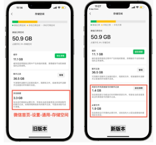 이전 버전의 저장공간 인터페이스에는 버퍼(缓存), 대화기록, 기타 데터 세가지 구역으로 이루어져있다. 그중 버퍼와 대화기록은 삭제할 수 있지만 기타 데이터는 삭제할 수 없었다.
