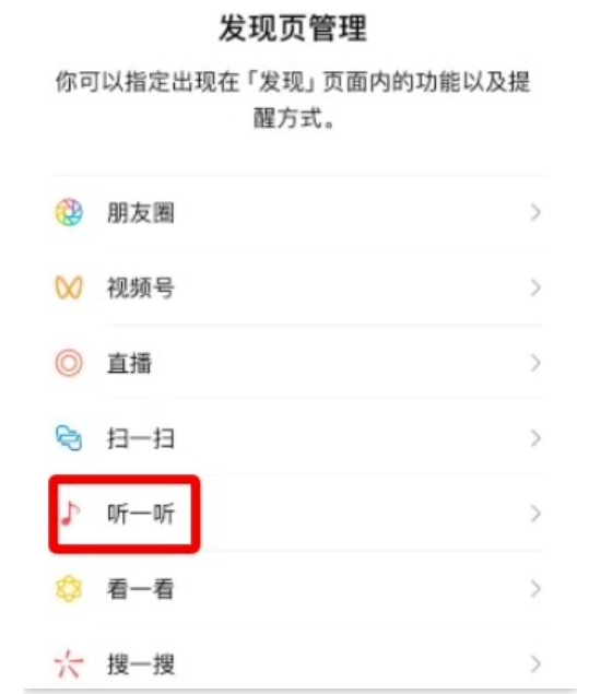 위챗의 발견인터페이스에는 ‘들어보기’의 1급 입구와 ‘스캔하기, 흔들기, 보기, 검색하기’가 배렬되여있다. 클릭하면 음악과 오디오 인터페이스로 들어갈 수 있는데 예전에는 메인 화면에서 음악 아이콘을 클릭해야 했다. 하지만 현재 이 기능은 그레이스케일 테스트(灰度测试)중이다.
