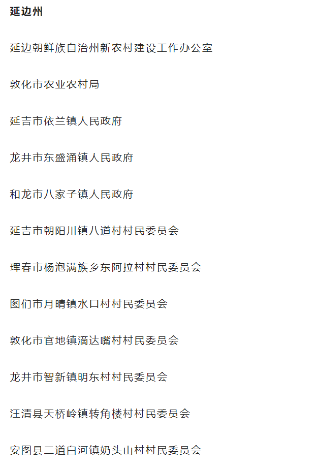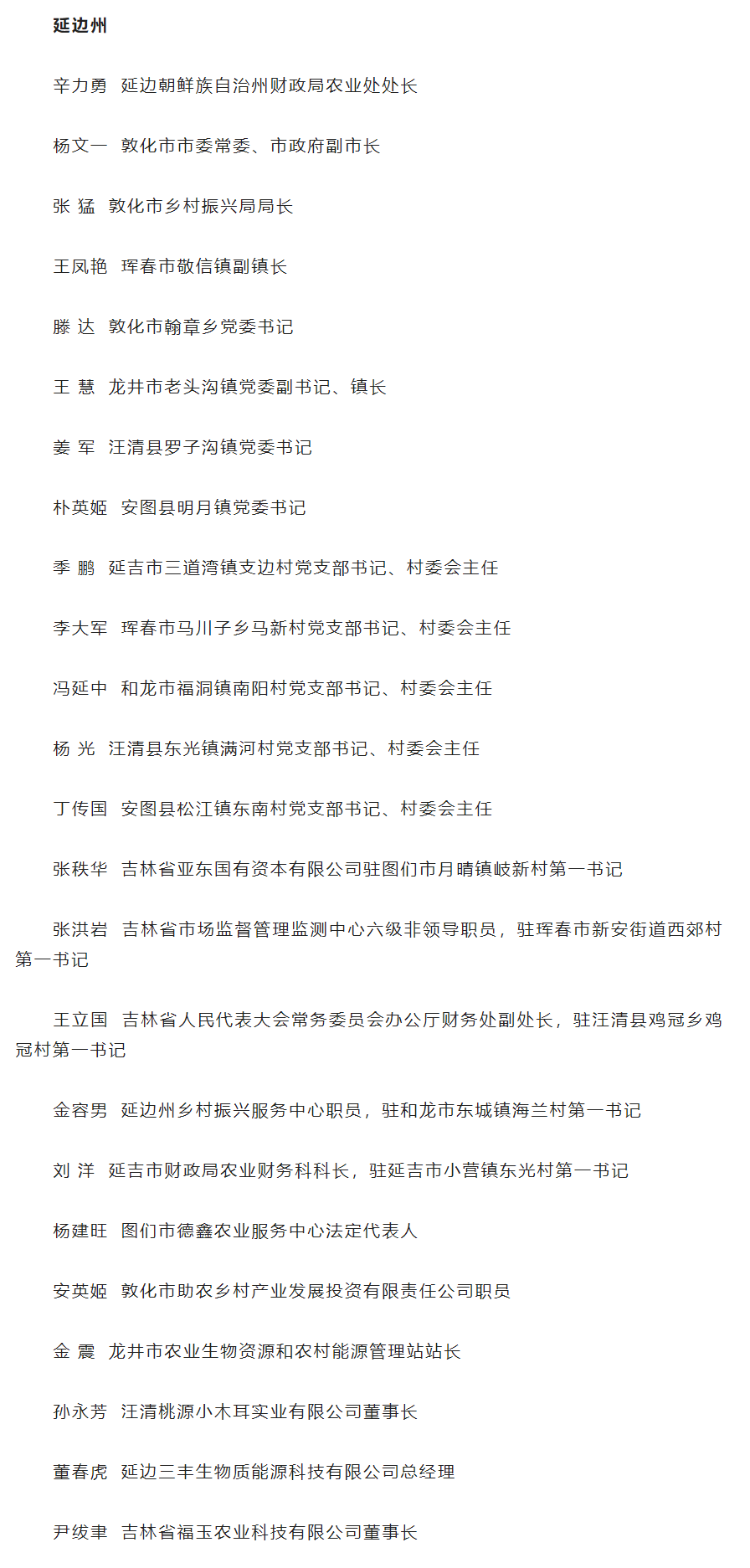 경험을 총화하고 선진을 표창하며 작위를 격려하고 전형시범 인솔역할을 충분히 발휘하며 간부와 군중 속에서 선진을 따라배우고 선진을 따라잡으며 선진이 되려는 짙은 분위기를 조성하고 광범한 '3농' 사업일군들이 새시대 새 로정에서 공을 세우고 업적을 쌓도록 인도하고저 성당위, 성정부는 길림성 100개 단위에 '길림성 향촌진흥 선진집단' 칭호를, 200명의 동지에게 '길림성 향촌진흥 선진인물‘ 칭호를 수여하기로 결정했다. 그중 연변주에서는 12개 단위가 '길림성 향촌진흥 선진집단', 24명의 개인이 '길림성 향촌진흥 선진인물’ 명단에 이름을 올렸다.