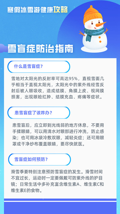 음력설이 림박하면서 많은 스키장들이 성수기에 접어들었다. 일부 초보자들은 겨울철에는 해빛이 강하지 않다고 생각해 선글라스와 고글 착용을 소홀히 한 탓에 눈물증상이 나타나고 통증을 호소하기도 한다. 전문가들은 맨눈으로 스키를 타면 설맹증에 걸리기 쉬우므로 예방에 주의를 기울여야 하며 설맹증상이 나타나면 손으로 눈을 비비지 말아야 한다고 당부했다.