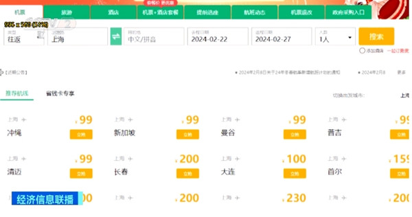 음력설후부터 3월 초까지 여러 목적지와 패키지 려행 가격이 음력설 이전보다 30%에서 50% 하락했으며 삼아, 북경, 운남과 같은 인기 목적지 가격은 ‘50% 하락’을 맞이했다. 이번 주부터 상해, 북경, 광주, 심천, 항주 등 중서부 도시로 가는 여러 로선에 100원 미만의 특가항공권이 등장했다. 례를 들어 이번 주 상해에서 중경으로 가는 항공권의 최저 료금은 31원, 상해에서 청도로 가는 항공권은 14원에 불과하다.