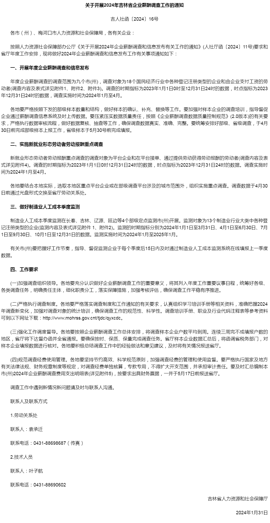 일전, 길림성인력자원및사회보장청에서 발부한 통지에 따르면, 인력자원및사회보장부 판공청의 <2024년 기업로임조사와 정보발포 관련 사업을 전개할 데 관한 통지>(인사청서[2024]11호)의 요구와 년도사업배치에 따라 길림성은 2024년 기업로임조사와 정보발포사업을 전개하게 된다.