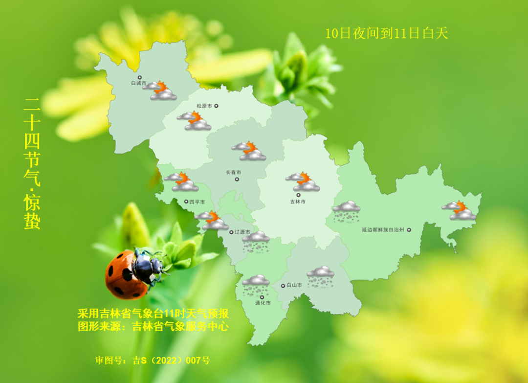 향후 10일간(3월 9일-18일) 길림성 평균기온은 -1.0℃ 안팎으로 평년 동기보다 다소 높겠고 길림성 평균강수량은 2밀리메터로 안팎으로 평년 동기보다 조금 적을 것으로 예상된다.