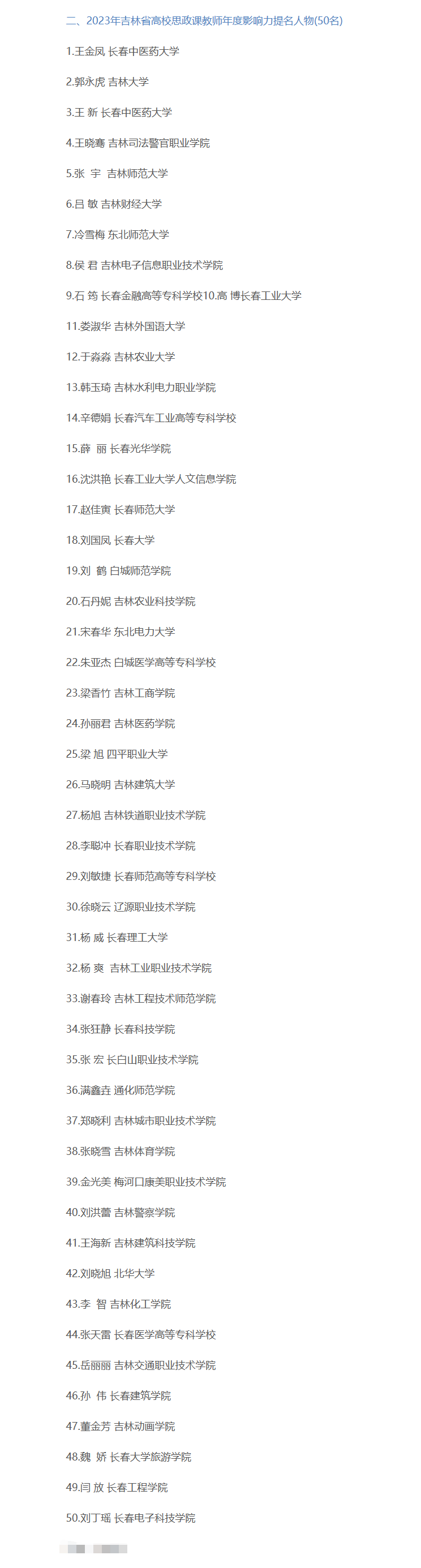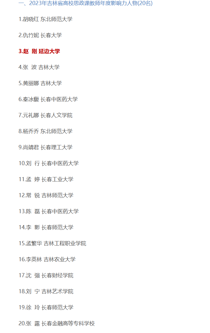 3월 7일 길림성교육청에서는 공고를 발부했는데 <2023년 길림성 대학교 사상정치과 교사 년도 영향력 인물 추천전시활동을 전개할 데 관한 통지>에 근거하고 학교 추천, 전문가 평심을 거쳐 '2023년 길림성 대학교 사상정치과 교사 년도 영향력 인물' 20명과 '2023년 길림성 대학교 사상정치과 교사 년도 영향력 추천 인물' 50명을 선정함과 아울러 평심 결과를 공시했다. 연변대학 교사 조강이 순위권에 들었는데 '2023년 길림성 대학교 사상정치과 교사 년도 영향력 인물'로 평의되였다.