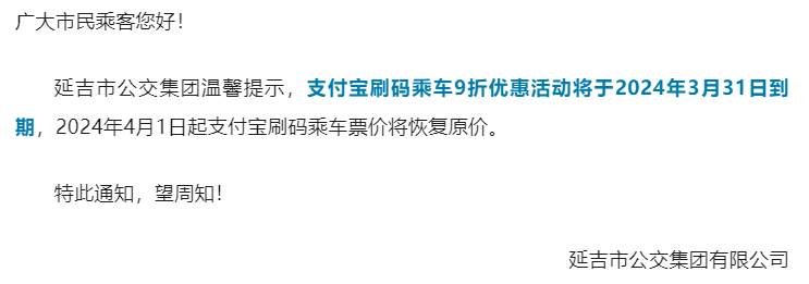 연길시공공뻐스그룹유한회사에서 알아본 데 따르면 알리페이 큐알코드를 스캔하여 탑승시 10% 할인하는 활동이 2024년 3월 31일 마감되고 2024년 4월 1일부터 알리페이 큐알코드를 스캔하여 탑승시 원래 가격으로 회복될 예정이다.