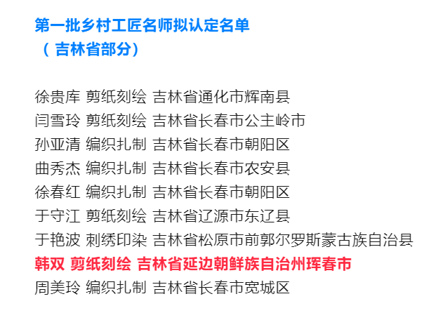 일전 농업농촌부, 교육부, 공업과정보화부, 인력자원및사회보장부, 주택도시향진건설부, 문화관광부, 전국부녀련합회는 제1진 향촌 장인 인정 명단을 연구결정하고 공시했다. 명단에는 273명이 입선되였는데 길림성에서 9명이 입선되였다. 우리 주에서는 훈춘시의 한쌍이 종이오리기 향촌 장인으로 입선되였다.