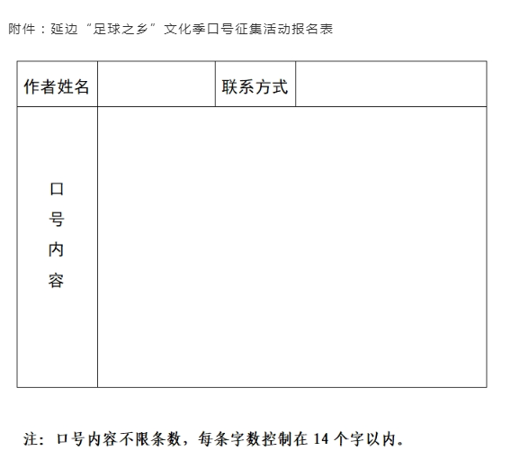연변축구문화 IP와 축구도시 새 태그를 적극 기획 구축하고저 우리 주에서는 연변 '축구의 고향' 문화시즌 계렬활동을 개최하게 된다. 현재 전사회를 대상으로 연변 '축구의 고향' 문화시즌 슬로건을 공모한다.내용은 다음과 같다.
