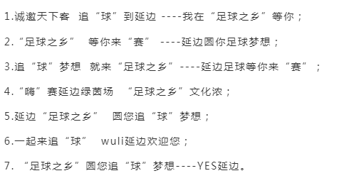 (2) 연변 ‘축구의 고향’ 문화시즌활동을 주제로 하거나 연변 ‘축구의 고향’ 도시문화정수를 보여주며 도시 이미지 슬로건을 자체적으로 만들거나 사투리, 열점단어 등 창의적이고 취미성이 다분한 슬로건도 가능하다.