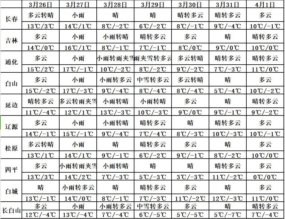 이번 주(3월 25일~31일) 길림성의 평균 기온은 약 2.0°C로 평년과 비슷할 것으로 예상된다. 이번 주 기온은 전기에 비교적 높다가 28일에 크게 떨어질 것으로 보인다. 길림성의 평균 강수량은 5.0mm로 평년보다 약간 많을 것으로 보인다. 구체적인 강수 과정을 보면 27일부터 28일까지 길림성 대부분 지역에 비가 내리다가 진눈까비 또는 적은 눈이 내리겠고 29~30일에는 중부와 남부 일부 지역에 적은 눈 혹은 소낙눈이 내릴 것으로 예상된다.