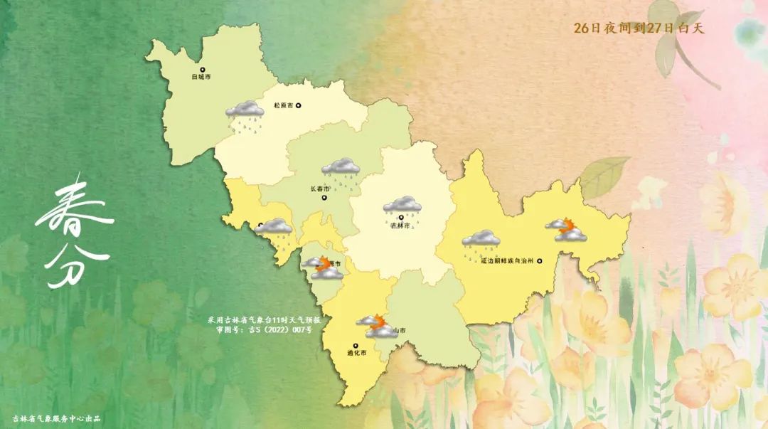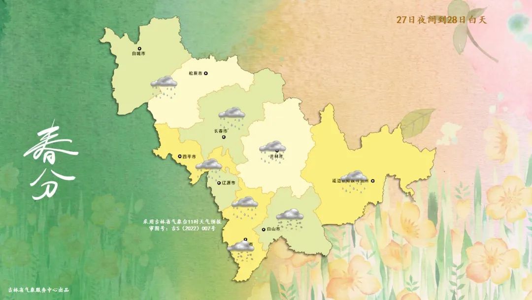 27일 밤부터 28일 낮까지 전 성 날씨는 구름이 많고 이따금 흐리겠으며 통화 남부, 백산, 장백산보호구에는 적은 비 혹은 진눈까비가 내리다가 적은 눈이 내리겠으며 기타 지역에는 적은 비 혹은 진눈까비가 내릴 것으로 예상된다.