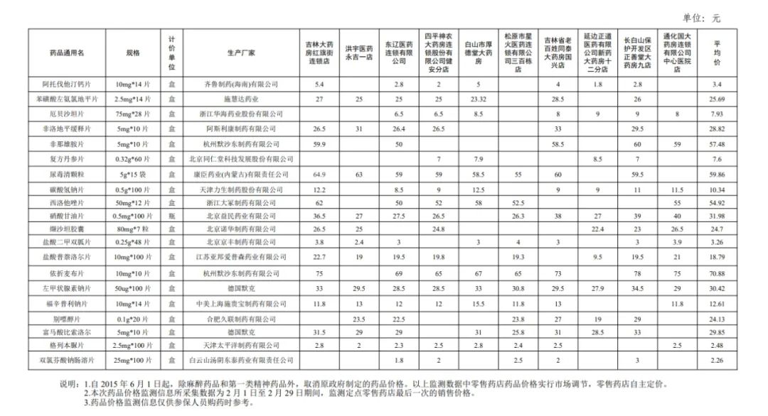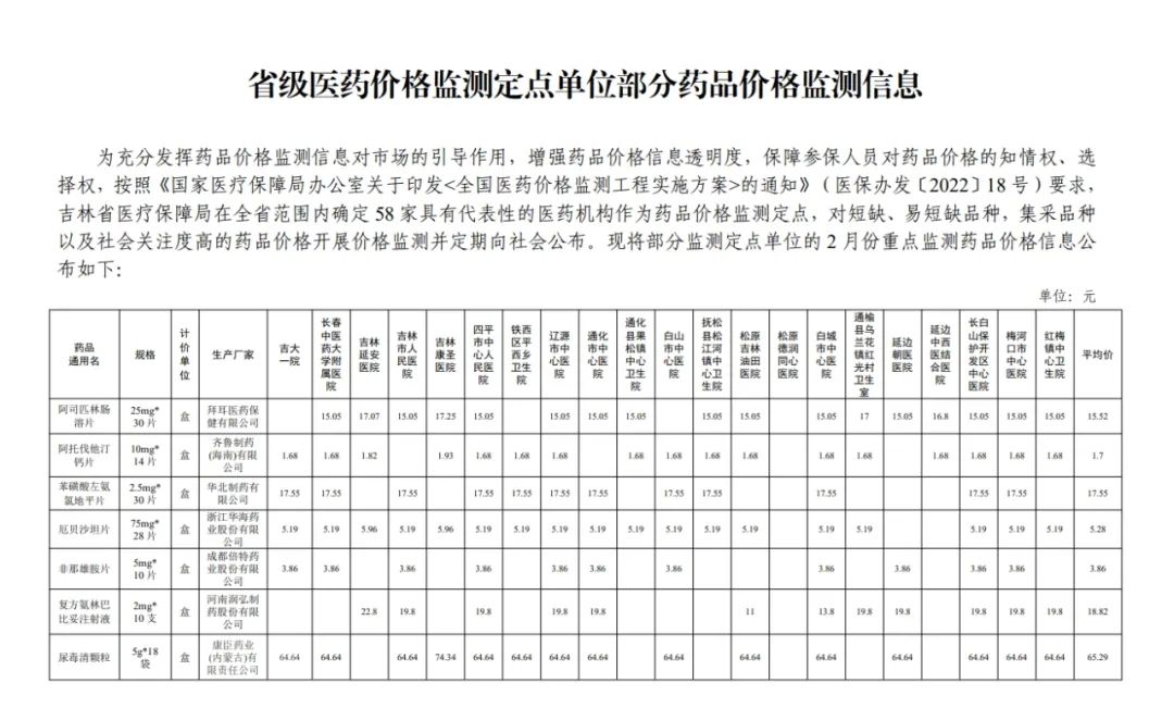 약품가격 감측정보의 시장 인도역할을 충분히 발휘하고 약품가격정보 투명도를 증강하며 보험가입인원들의 약품가격에 대한 알 권리 및 선택권을 보장하기 위해 "'전국 의약가격 감측공정 실시방안'을 인쇄발부할 데 관한 국가의료보장국 판공실 통지"(의보판발[2022]18호)의 요구에 따라 길림성의료보장국은 전 성 범위내 58개 대표적인 의약기구를 약품가격 감측지점으로 정하고 부족한 품종, 집중구매 품종 및 사회 주목도가 높은 약품의 가격에 대해 가격감측을 실시하고 정기적으로 사회에 공개한다. 현재 부분적 감측 지정단위의 2월 중점 감측 약품 가격정보를 다음과 같이 공개한다.