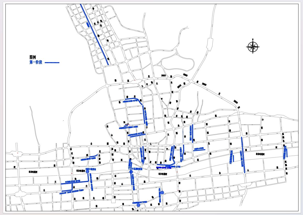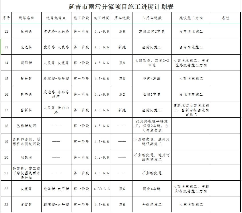 시공은 3개 단계로 나누어 진행되는데 그중 1단계는 4월 5일부터 6월 6일까지이며 주요 도로 11갈래, 보조 간선 도로 4갈래, 분기 도로 2갈래, 비물 리프트 펌프장 2곳, 하천 도관 3곳, 상부 도관 한곳, 배수구 한곳이 포함된다. 교통에 비교적 큰 영향을 미치는 도로는 6갈래인데 각기 장백산로(진달래거리~룡동거리), 천지로(룡동거리-신풍거리), 국자거리(북양로-건강로), 애단로(삼꽃거리-국자거리), 조양거리(인민로~우의로), 우의로(조양거리-진학거리)이다. 교통 압력을 완화하기 위해 시공조는 도로 구간을 나누고 반폭 시공을 진행하게 되는데 광범한 시민들이 출행 방식과 로선을 합리하게 계획하기 바란다.