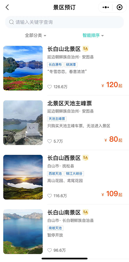 4월 5일 길림성장백산풍경구관리유한회사가 발부한 공고에 따르면 2024년 4월 3일 0시부터 장백산풍경구는 티켓구매 미니응용프로그램 ‘장백산 일기유(一机游,휴대폰 한대로 려행을 즐기자)’를 새로 출시했으며 쇼핑 선택과 려행 체험 등 다양한 서비스가 제공된다.