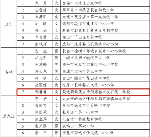 연변조선족자치주 훈춘시 판석진중학교 추림림 교원이 명단에 이름을 올렸다.