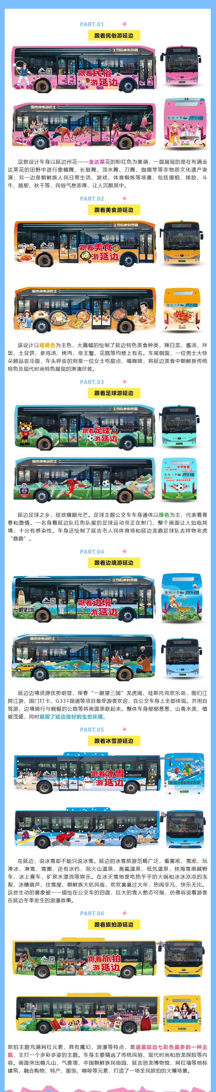 특정된 주제의 공공뻐스 선전활동은 주문화라지오텔레비죤방송및관광국에서 기획, 주최하였고 '연변문화관광부문 따라 연변 관광'의 선전주제를 담체로 하여 연변주 수부도시인 연길시에서 '민속 따라 연변 관광' '맛 따라 연변 관광' '축구 따라 연변 관광' '변경 따라 연변 관광' '빙설 따라 연변 관광' '려행촬영 따라 연변 관광' 등 6대 주제로 12대 공공뻐스를 장식하고 전 시 주요 로선에서 류동 선전을 펼치게 된다. 주로 연길서역, 기차역, 중국조선족민속원 등 지점을 피복했다.