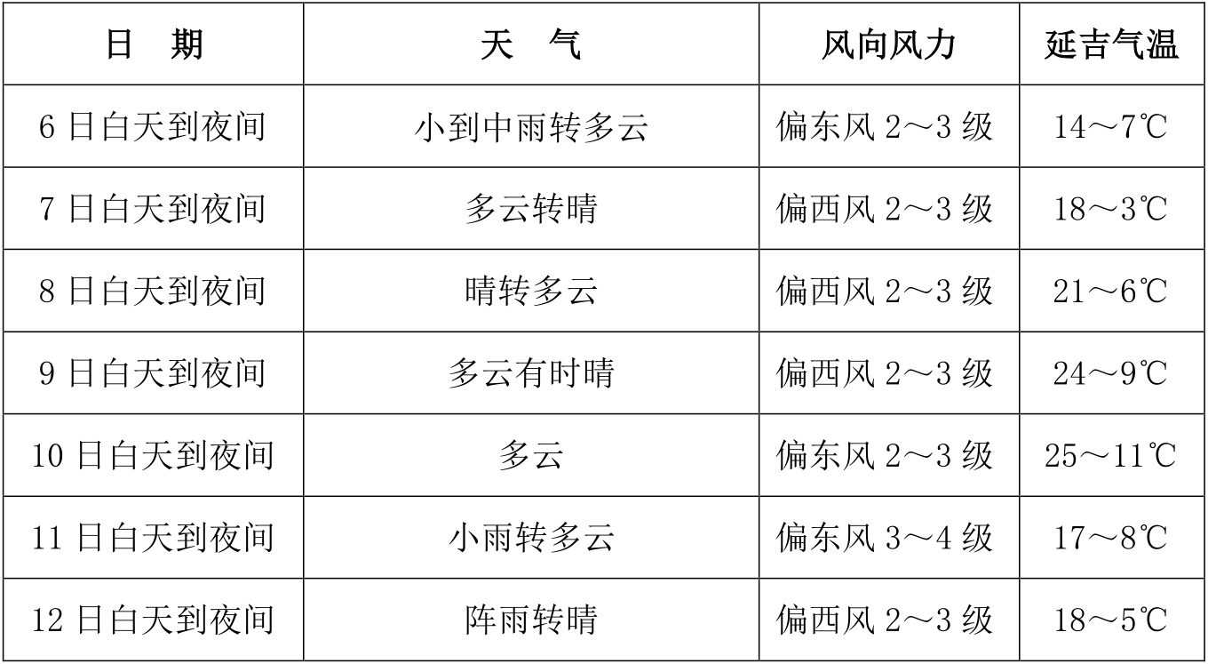 전 주 평균기온은 12.5℃ 안팎으로 평년동기보다 0.3℃ 가량 높겠고 이번 주 기온 파동이 비교적 클 것으로 전해진 가운데 5월 6일 기온은 비교적 낮고 8일 아침 우리 주 산간지역에는 서리가 내리겠으며 낮부터 기온은 상승되겠고 11일 하락될 것으로 예상된다. 5일 밤 우리 주에는 뚜렷한 강수가 나타났고 전 주 평균강수량은 21.4밀리메터에 달했다. 이번 주 여전히 15밀리메터 좌우의 강수가 있을 것으로 보이는 바 평년 동기(13.7밀리메터)보다 뚜렷이 많을 것으로 전해졌다.