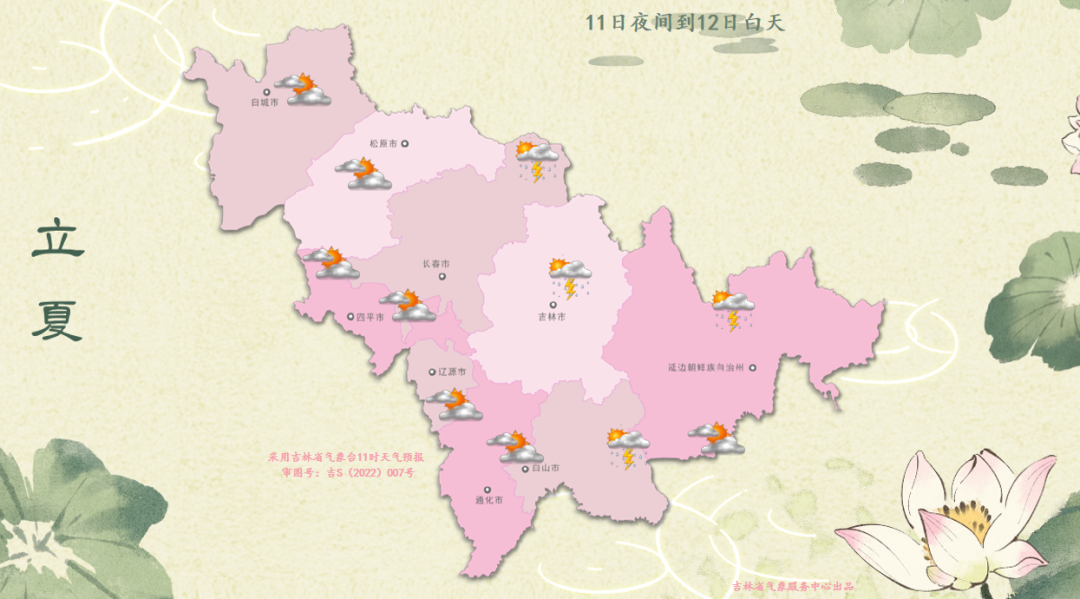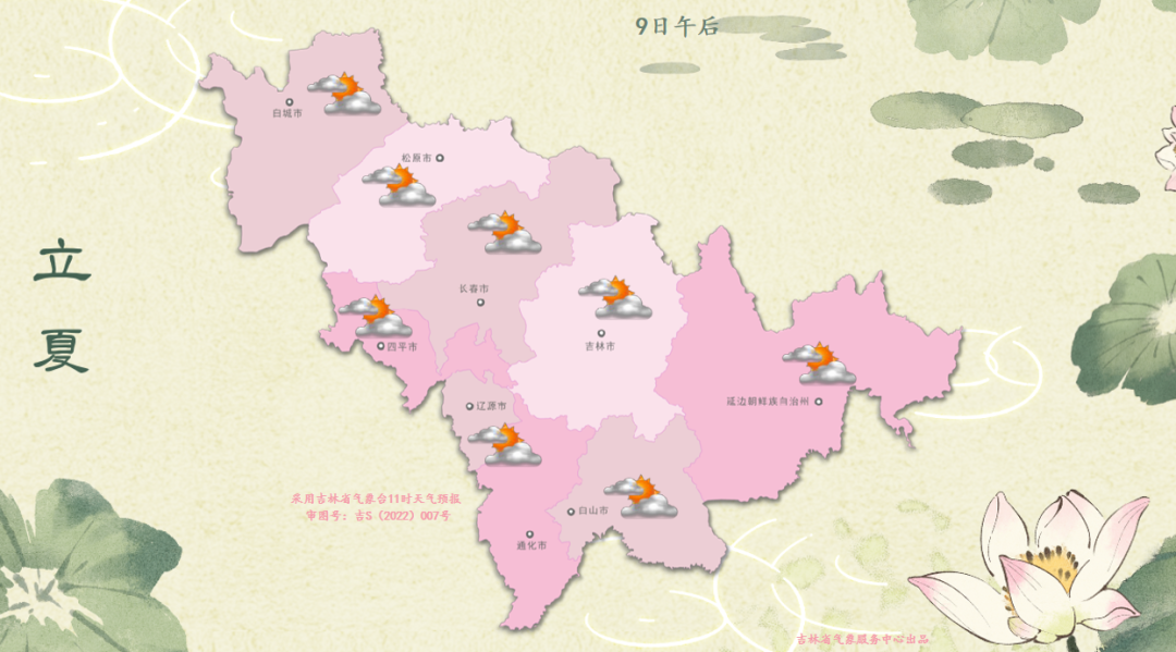 10일 밤부터 11일 낮까지 길림성은 구름이 많이 끼겠고 백성 북부, 송원 북부, 료원, 길림 남부, 통화, 백산 서부에는 적은 비 혹은 중등 정도의 비가 내리겠고 기타 지역에는 소나기 혹은 천둥 번개를 동반한 소나기가 내릴 것으로 보인다.