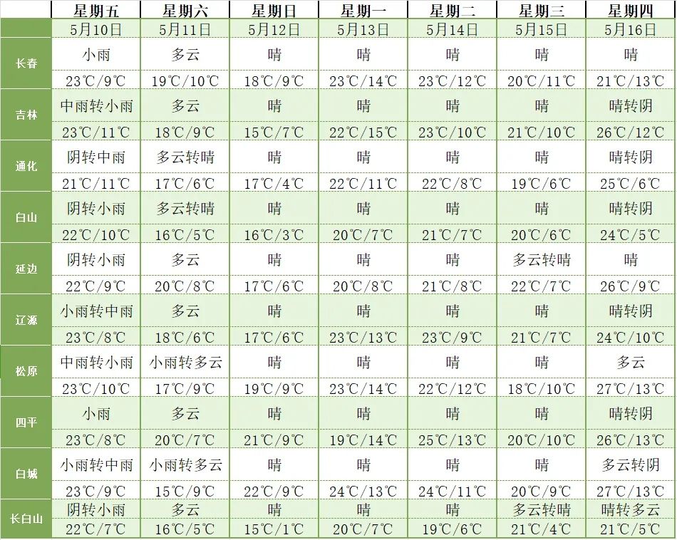 고공 소용돌이 영향으로 5월 10일 새벽부터 12일 낮까지 길림성은 서-동 방향으로 한차례 강우날씨를 맞이하게 된다. 한편, 11일 밤부터 12일 낮까지 연변 북부, 장백산보호구에는 소나기 혹은 천둥 번개를 동반한 소나기가 내릴 것으로 보인다.