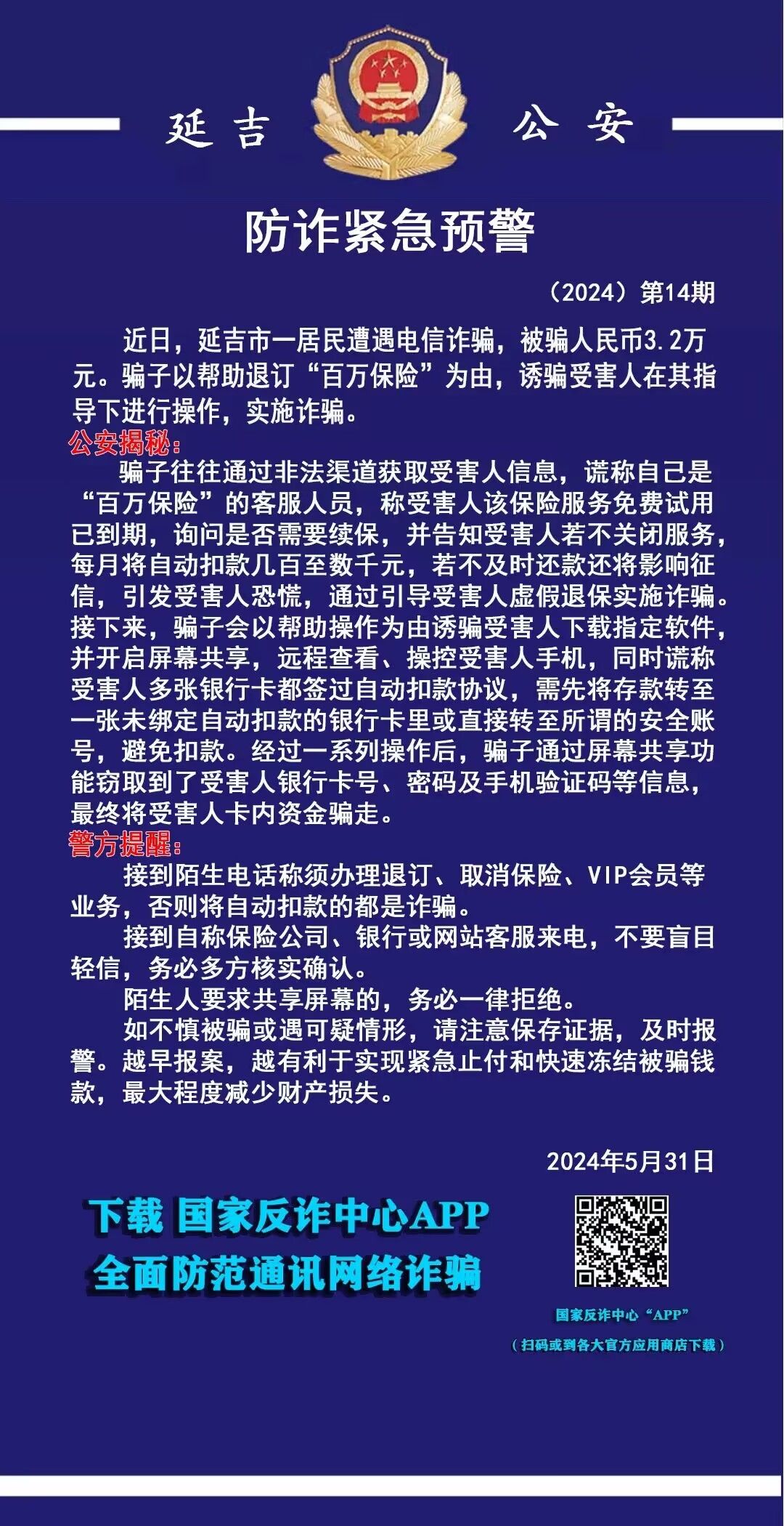연길 한 주민이 전신사기를 당해 3.2만원을 피해본 사건이 발생했다. 사기군은 '백만보험' 해지를 도와준다는 리유로 피해자가 지시대로 움직이도록 인도해 사기를 친다.