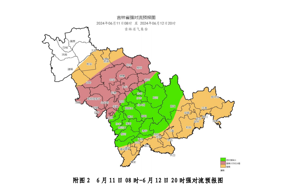 6월 11일 오후부터 밤까지 송원, 장춘, 사평, 료원, 길림, 통화 북부는 대류날씨가 나타날 가능성이 있겠고 천둥 번개날씨가 위주겠으며 그중 송원 동부, 장춘 대부분 지역, 사평 대부분 지역, 료원, 길림 서부 부분적 지역에는 우박 혹은 천둥 우뢰, 강풍이 나타날 것으로 예상된다.