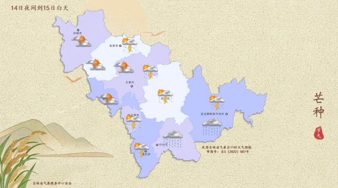 14일 밤부터 15일 낮까지 길림성은 구름이 많겠으며 백산, 연변 남부, 장백산보호구에는 중등 정도의 비가 내리고 일부 지역에는 큰 비가 내리며 송원 동북부, 장춘 동부, 료원, 길림, 통화, 연변 북부에는 소나기가 내리겠다.
