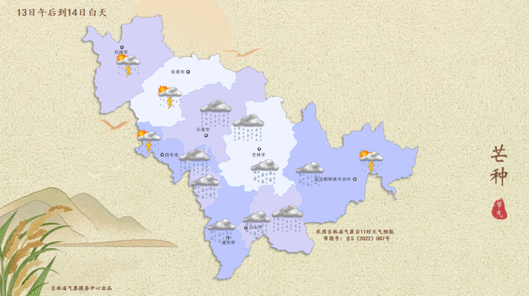 기상부문에 따르면 13일 오후부터 14일 낮까지 구름이 많고 이따금 흐리며 료원, 길림 동부와 남부, 통화, 백산 서부, 연변 서부에는 중등 정도 내지 큰 비가 내리고 일부 지역에는 큰 비 내지 폭우가 내리며 장춘, 사평 남동부, 길림 서북부, 백산 동부, 장백산보호구에는 중등 규모의 비가 내리고 일부 지역에는 단시간 강우, 뢰우 또는 우박과 같은 강대류 날씨를 동반하고 기타 지역에는 소나기가 내릴 것으로 보인다.