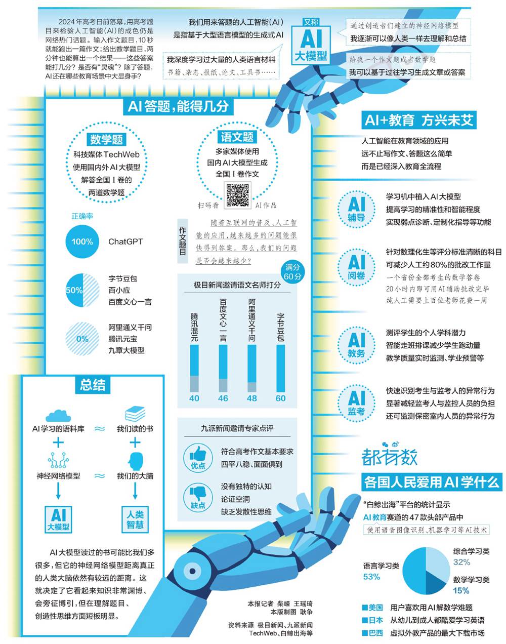 2024년 대학입시가 며칠전 막을 내렸는데 대학입시 문제로 인공지능(AI)의 능력을 시험하는 것이 인터넷 인기화제가 되였다. 작문제목을 입력하면 10초 만에 작문이 한편 나오고 수학문제를 내면 2분 만에 답안을 써내는데 이런 답안은 몇점이나 맞을 수 있을가? ‘령혼’이 담겨있을가?