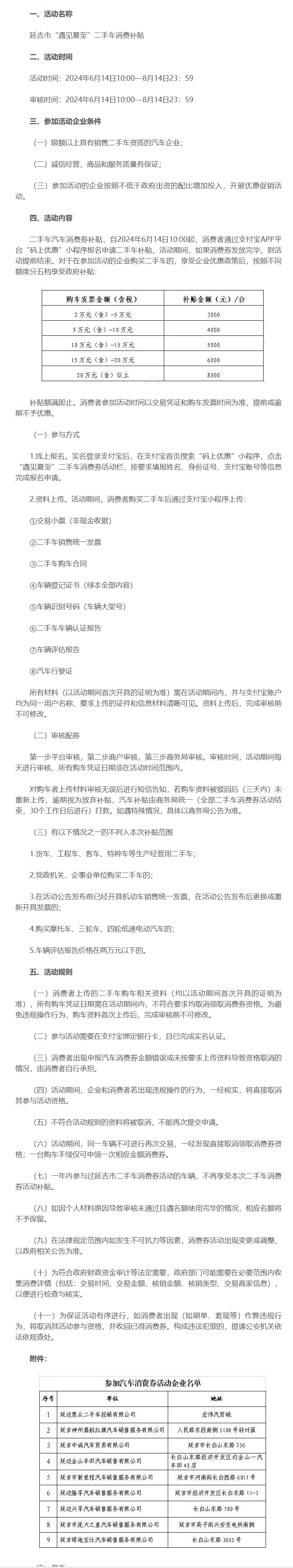 중고차 재고량을 활성화시키고 중고차 업종 발전을 번영시키며 중고차 소비시장 잠재력을 일층 자극하고 경제성장에 대한 소비 촉진역할을 발휘시키기 위해 연길시정부는 2024년 6월 14일부터 86.3만원을 투입하여 중고차 소비 보조 활동을 전개하기로 했다. 구체적인 활동방안은 다음과 같다.