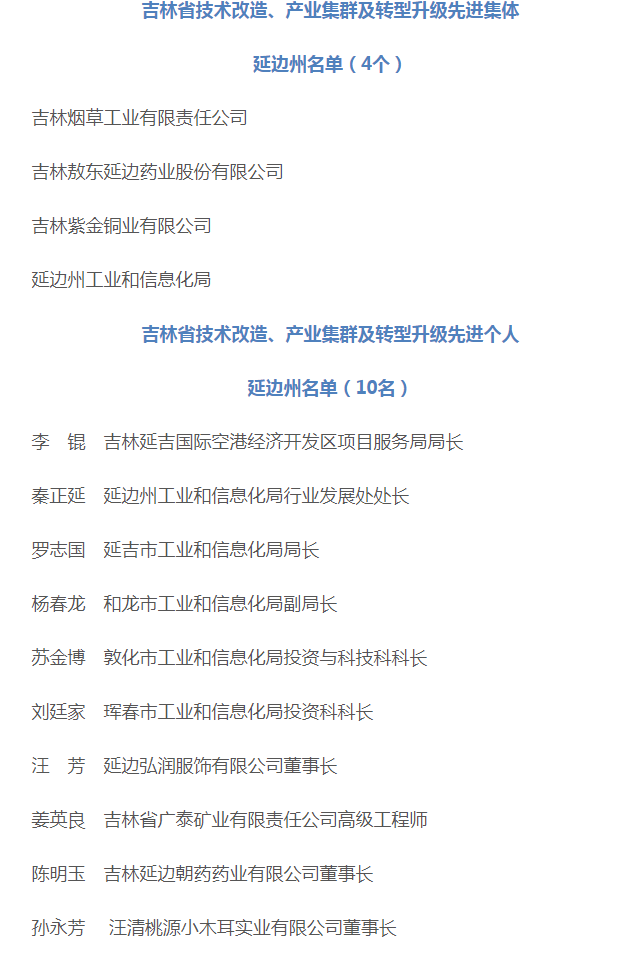 6월 19일 길림성인민정부는 길림성 기술개조, 산업집군 및 전환승격 선진집체와 선진인물을 표창할 데 관한 결정을 발부했다. 40개 집체가 '길림성 기술개조, 산업집군 및 전환승격 선진집체'칭호를, 100명 인물이 '길림성 기술개조, 산업집군 및 전환승격 선진인물' 칭호를 수여받았다. 그중 우리 주에서 4개 집체, 10명 인물이 명단에 이름을 올렸다.