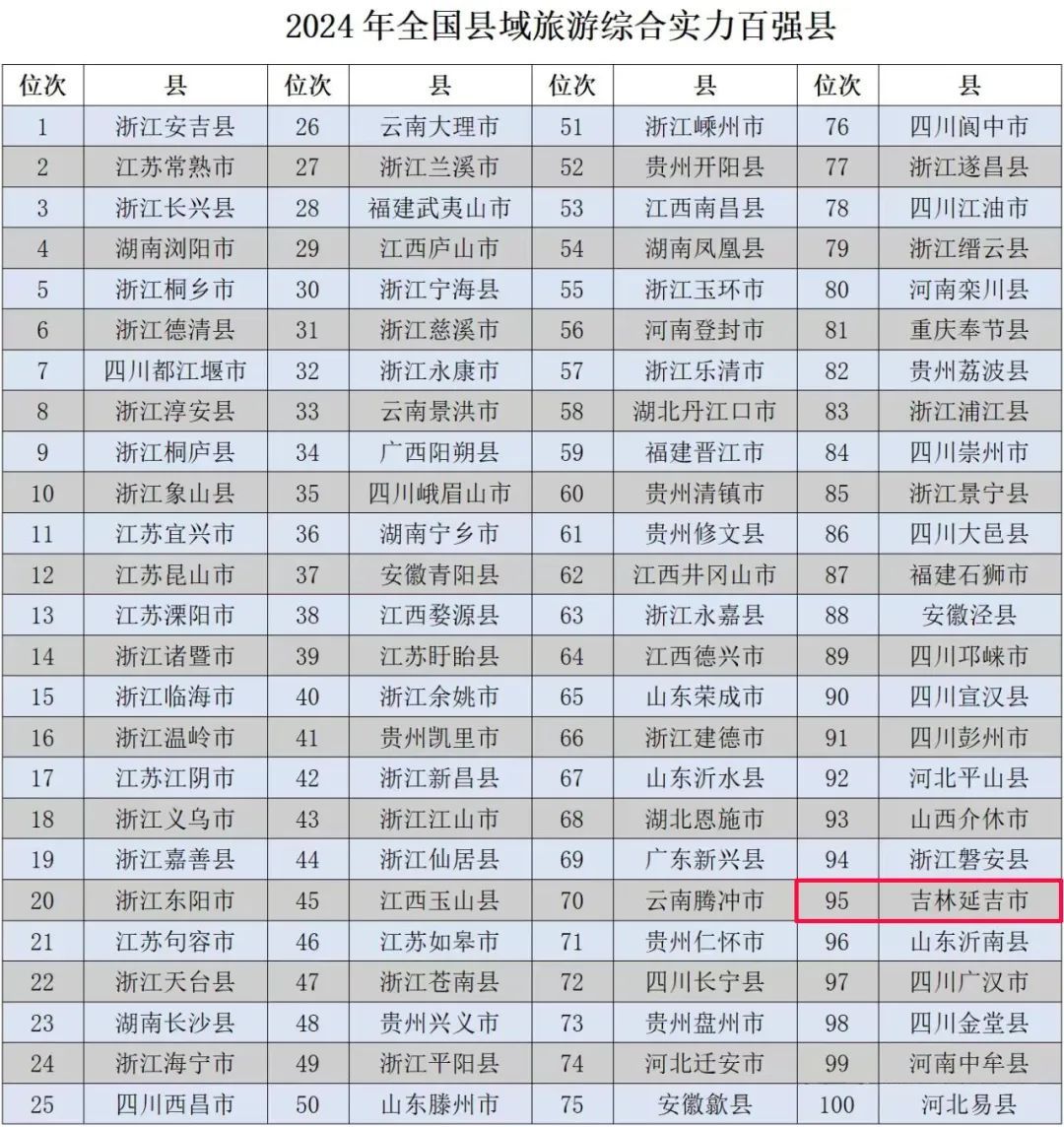 보고에 따르면 연길시는 '2024년 전국 현역관광 종합실력 백강현'에서 95위를 차지했는데 동북지역에서 유일하게 순위에 오른 현시이다.