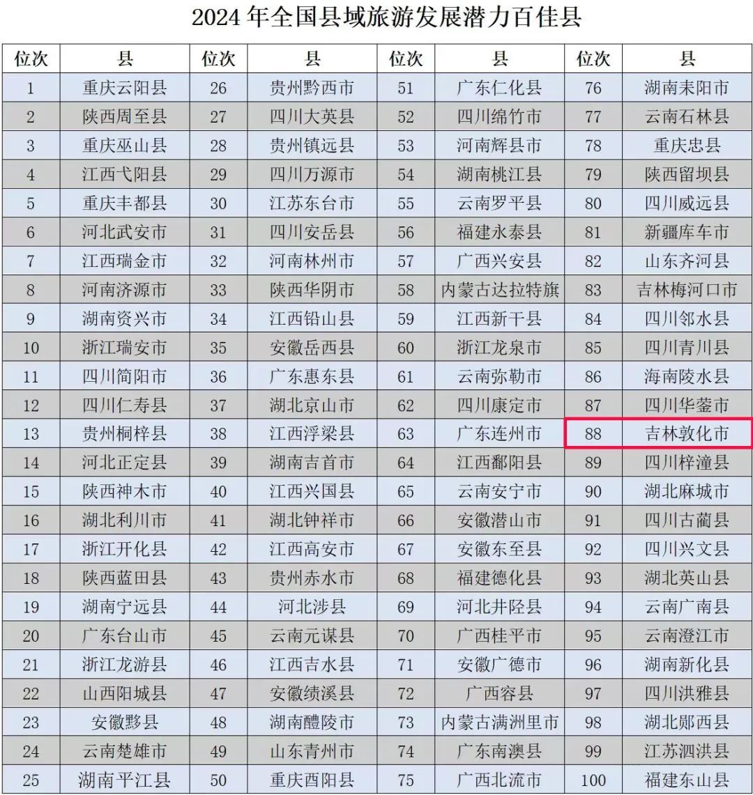 '2024년 전국 현역관광 발전잠재력 백가현' 명단에서 돈화시는 88위를 차지했다.