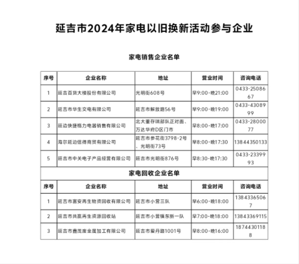 연길시상무국에 따르면 소비품 보상판매에 관한 국가와 성의 사업포치를 전면 관철 시달하고 친환경 순환경제 발전을 추동하며 광범한 소비자들의 가전제품 보상판매 수요를 일층 만족시키고저 연길시정부는 7월 23일부터 한달간 가전제품 보상판매 및 친환경 지능 가전제품 만가진입 계렬활동을 펼치게 된다. 첫단계 활동에서 자금 50만원을 투입할 계획인데 11개 종류의 신제품 구매와 9개 종류의 중고 제품의 교환에 사용된다. 연길시내(현역 포함)의 5개 가전제품 판매기업과 3개의 가전제품 회수기업에서 중고 제품 판매와 신제품 구매 전 과정을 완수하는 소비자 및 조건에 부합되는 기업사업단위는 모두 이 보조를 향수할 수 있다.