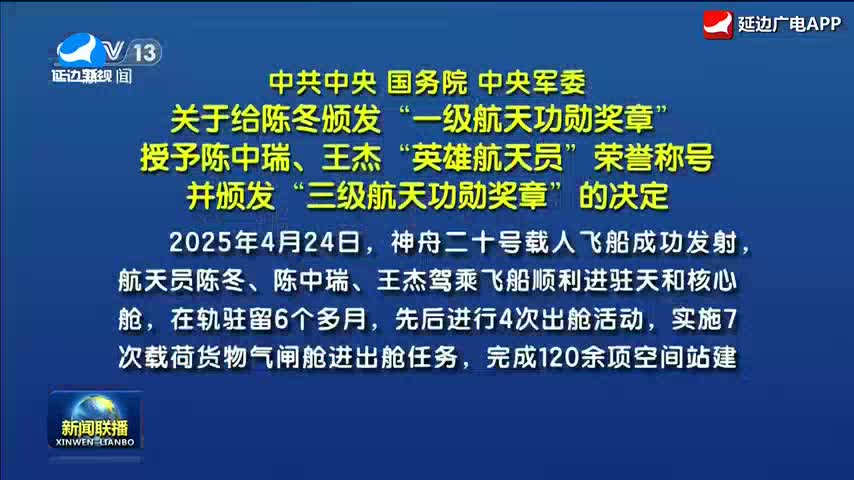 진동에게 ‘1급 우주비행 공훈메달’을 수여, 진중서 왕걸에게 ‘영웅 우주비행사’영예칭호와 ‘3급 우주비행 공훈메달’을 수여할 데 관한 중공중앙 국무원 중앙군위 결정