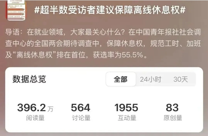전국정협 위원인 려국천은 3년 련속 ‘보이지 않는 초과근무’ 문제에 주목해왔다. 그는 일부 기관이 ‘야근문화’를 ‘근면’의 겉옷으로 포장하여 직장내 암묵적인 규칙이 되였으며 이로 인해 직원들은 ‘몸은 조조의 진영에 있지만 마음은 한나라에 있는’ 상태로 심신이 모두 지쳐있다고 지적했다. 현행 법률은 ‘근무시간’에 대한 정의가 여전히 ‘물리적 출퇴근’ 수준에 머물러있어 ‘오프라인휴식권’이 결여되여있으며 각 지역의 집행기준이 달라 많은 사건이 야근으로 인정되기 어렵다.