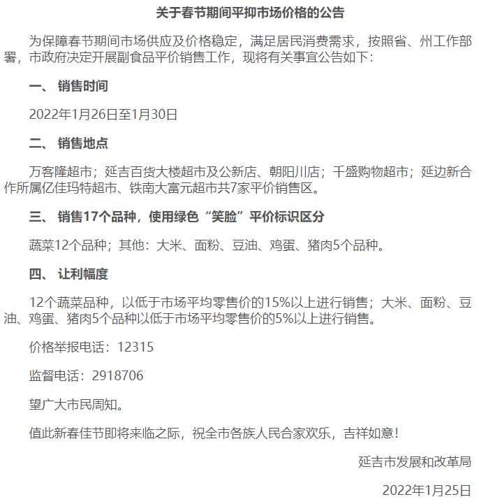 음력설기간 시장공급 및 가격안정을 보장하고 주민들의 소비수요에 만족주기 위해 1월 26일부터 30일까지 연길시 7곳의 슈퍼마켓에서 부식품을 평가판매하게 된다.