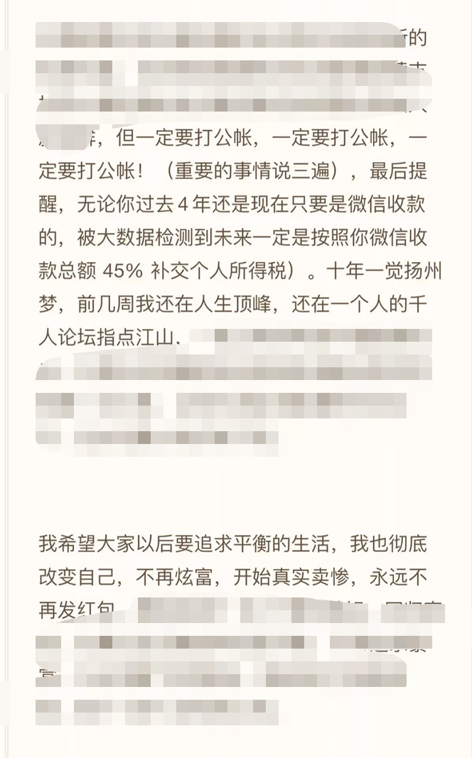 공개 서한에는 또 향후 신규 단체방의 수금은 “반드시 공금으로 때려야 한다”고 주장했다. “과거 4년이나 지금이나 위챗 수금은 빅데이터에 잡히면 반드시 위챗 수금 금액의 45% 기준으로 개인 소득세를 추가 납부해야 한다.”